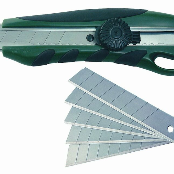 Egonomiczna obudowa z tworzywa sztucznego,elementy gumowe zapobiegają ślizganiu się dłoni.Przycisk blokujący pozycję ostrza.prowadzenie ostrza wzmocnione metalową szyną.łamane wymienne ostrze ze stali nierdzewnej.