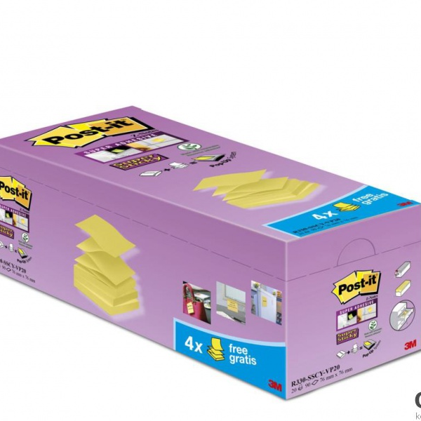 Bloczek samoprzylepny POST-IT_ Super sticky Z-Notes (R330-SSCY-VP20), 76x76mm, 16x90 kart., zółty, 4 bloczki gratis