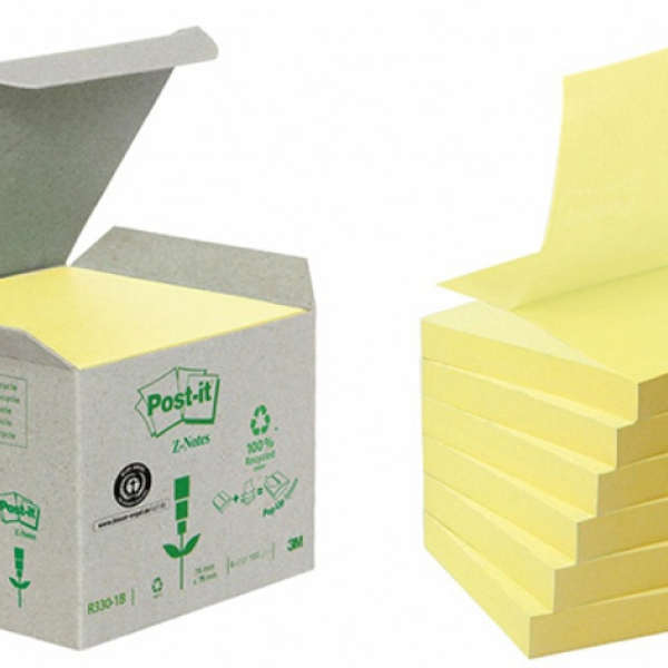Ekologiczne karteczki samoprzylepne z certyfikatem PEFC Recycled to funkcjonalność klasycznych karteczek Post-it_ w połączeniu z najwyższym standardem dbałości o środowisko naturalne. ;Idealne dla osób, które często korzystają z karteczek samoprzylepnych._Włóż harmonijkowy bloczek do podajnika Post-it_ Z-Notes i wyciągnij pierwszą karteczkę, kolejna wysunie się automatycznie._Produkt stworzony zgodnie z ideą "zero waste" - w całości wyprodukowany z surowców odnawialnych, a po użyciu wszystkie elementy nadają się do ponownego recyklingu i_wyprodukowania nowych karteczek ekologicznych Post-it_._Papier do produkcji karteczek i opakowania w 100% został wyprodukowany z segregowanych odpadów papierowych, w tym 30% z odpadów komunalnych - nie zostało ścięte żadne drzewo._Jako jedyne mają papier bielony metodą PCF bez użycia chloru, co minimalizuje powstawanie substancji potencjalnie szkodliwych dla środowiska._Klej do tych karteczek w 60% wyprodukowano z surowców roślinnych, które odrastają w 12 miesięcy - mniejsze wykorzystanie pochodnych ropy naftowej w przeciwieństwie do produktów innych marek._Karteczki z klasycznym klejem Post-it_ są idealne, gdy przyklejasz je do papieru - trzymają się mocno i odklejają bez śladu._Świetne do ważnych dokumentów, zdjęć, gazet, katalogów i innych delikatnych papierowych powierzchni._Grubszy papier w 100% z pulpy drzewnej, po którym wygodnie jest pisać m.in. długopisem, ołówkiem, cienkopisem, piórem._Papier o gramaturze 80g/m2, z certyfikatem PEFC Recycled, bielony bez użycia chloru. Akrylowy klej repozycjonowalny 3M w technologii mikrosferycznej, w 60% z roślin, na bazie wody. Po użyciu produkt nadaje się do recyklingu._Opakowanie zawiera 6 bloczków po 100 karteczek w oryginalnym kanarkowo żółtym kolorze, w rozmiarze 76 x 76 mm_Bloczek samoprzylepny Post-it_ wraz z opakowaniem po użyciu nadaje się do recyklingu i może być segregowany razem z papierem. Podejmuj świadome decyzje i sprawdź czy karteczki samoprzylepne na Twoim biurku mają informację potwierdzającą, że nadają się do recyklingu._Każdy notes samoprzylepny Post-it_ dostępny w Polsce został wyprodukowany z surowców z certyfikowanych źródeł, przy zachowaniu najwyższych standardów kontroli jakości i warunków pracy we własnych zakładach produkcyjnych 3M_ w USA i/lub Europie, z dbałością o środowisko - od źródła, poprzez Twoje biurko, a następnie recykling i ponowne wykorzystanie.