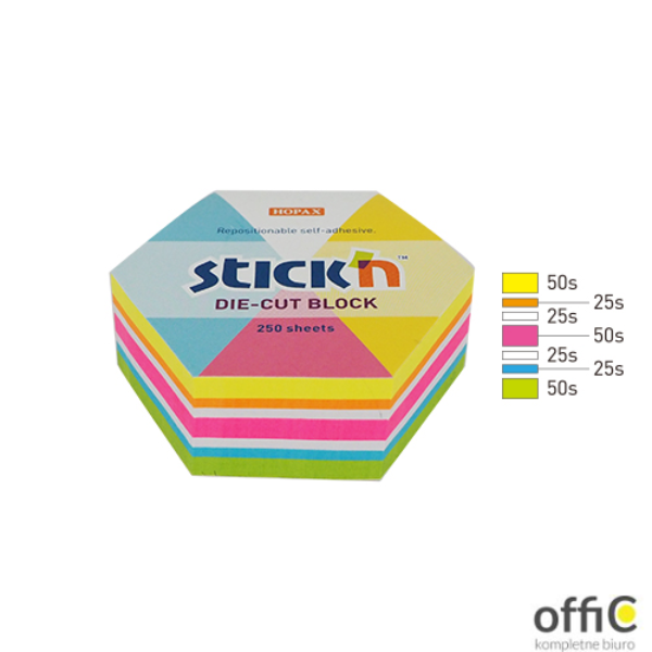 Notes sześciokąt, 61x70mm, mix 5 kol. neon+biały, 250kart. Stick"n 21827