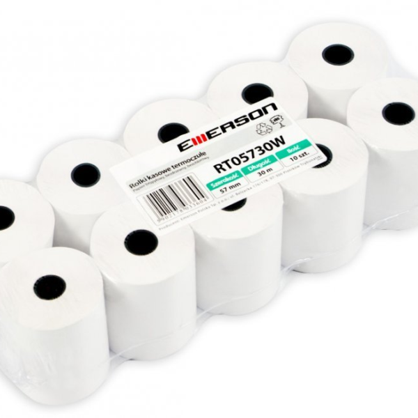 ROLKI TERMICZNE I FAKSOWE - produkowane są z papieru termoczułego o gramaturze 55 g/m . Producent papieru udziela gwarancji trwałości wydruku do 6 lat. Typowe zastosowanie rolek termicznych: * kasy, * bankomaty, * telefaksy. Proces produkcji obejmuje również projektowanie i nadruk na rolkach dodatkowych informacji bądź reklamy. Najwyższa jakość rolek Emerson zapewnia komfort pracy i bezpieczeństwo użytkowników. Rolki pakowane są w folię termokurczliwą, zapewniającą wysoką estetykę i trwałość produktu. - jednostka sprzedaży 1 opakowanie