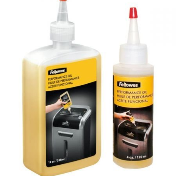 Olej do niszczarek Fellowes - Przeznaczony do niszczarek tnących na ścinki - Zapobiega osadzaniu się ścinek na nożach tnących urządzenia - Usprawnia pracę niszczarki - Pojemność 350 lub 120 ml - jednostka sprzedaży 1 sztuka