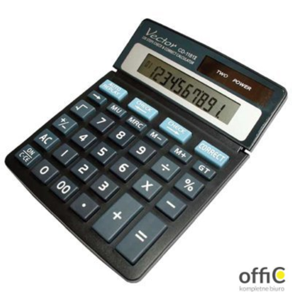 Kalkulator Vector CD-1181II -10 pozycyjny -podwójne zasilanie -regulowany wyświetlacz -funkcja check&correct do 120 kroków -obliczanie marży wymiary 151x120x20 mm - jednostka sprzedaży 1 sztuka