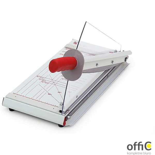 gilotyna biurowa z ręcznym systemem docisku papieru_przezroczysta osłona zapewniająca bezpieczeństwo pracy_ergonomiczny uchwyt przeciwpoślizgowy_na blatach roboczych standardowe szablony formatów_jednorazowe cięcie do 24 kartek 70g_certyfikat bezpieczeństwa GS_długość cięcia: 320 mm