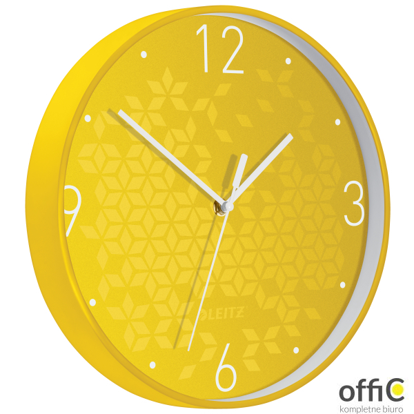 Element kolekcji Leitz WOW oferującej szeroki wybór stylowych produktów biurowych dostępnych w przykuwających wzrok kolorach i wyrafinowanym wzornictwie, które pozwoli Ci wyrazić swoją osobowość. Zaprojektowane z myślą o osobach pracujących w biurach lub często przemieszczających się_Średnica tarczy 29 cm_Cichy, kwarcowy mechanizm_Konstrukcja z solidnej, plastikowej, dwukolorowej ramy ze szklanym frontem_Tarcza z geometrycznym wzorem w kolorach WOW i dużymi cyframi_Trzy czarne wskazówki zegara są dobrze widoczne na tle tarczy_Z wygodnym otworem do zawieszania_Działa na 1 baterię AA (niedołączana do zestawu)