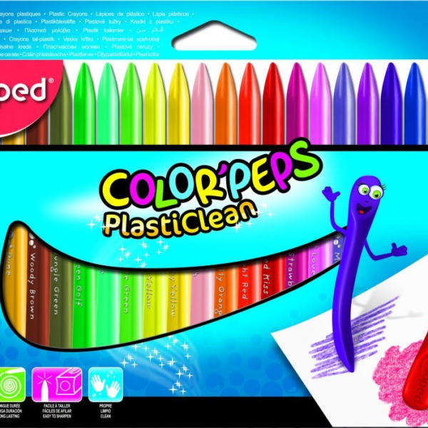 Nowa gama kredek plastikowych Maped. Wyprodukowana zgodnie z wszystkimi regulacjami dotyczącymi produktów przeznaczonych dla dzieci. Kredki mają trójkątny przekrój, z jednej strony są zaostrzone do precyzyjnego rysowania, a z drugiej płaskie do zamalowywania większych powierzchni. Intensywne kolory. Nie brudzą rąk. Zużywają się 3 razy wolniej niż standardowe kredki. Łatwe do temperowania. Pudełko 24 szt