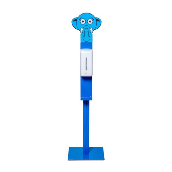 Stojak do dezynfekcji rąk zaprojektowany specjalnie dla dzieci. Aluminiowy słupek wsparty na stalowej podstawie z regulowaną wysokością. Automatyczny dozownik o pojemności 0,5 l. Nie trzeba ręcznie wciskać przycisku, wystarczy umieścić dłonie pod dozownikiem, a kropla żelu albo płynu do rąk automatycznie umyje lub zdezynfekuje ręce. Górna część z zabawnym motywem zwierzęcej głowy, pomalowana proszkowo. Dostępny w trzech atrakcyjnych kolorach. Wybierz zabawną zieloną głowę żaby, różową głowę kota lub niebieską głowę słonia i spraw, aby dzieci chciały ciągle z niej korzystać. Idealny do zastosowania w szkołach, na placach zabaw czy w przedszkolach.