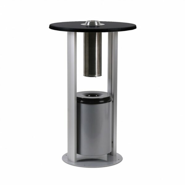Wolnostojący stolik z popielniczką ze stali nierdzewnej. Odporny na warunki atmosferyczne, z ogniotrwałym, okrągłym blatem o średnicy 700 mm. Użyte materiały gwarantują, że popielnica nie zardzewieje i nie zostanie uszkodzona przez niedopałki. Otwór w blacie posiada rozwiązanie odprowadzające odpadki do pojemnika pod blatem. Zbiornik na popiół wyposażony jest w otwieraną do dołu zapadkę ułatwiającą opróżnianie zawartości. Odpadki wpadają od razu do kosza, który znajduje się poniżej. Do pojemnika na niedopałki można dostać się wyłącznie za pomocą klucza. Doskonałą stabilność całej konstrukcji zapewnia ciężka, stalowa podstawa z nawierconymi otworami umożliwiającymi przymocowanie na stałe do podłoża. Popielnicę dostarczamy całkowicie zmontowaną i gotową do użycia.