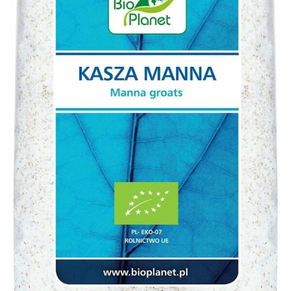 SKŁADNIKIkasza manna* (zawiera gluten) 100% (*certyfikowany składnik ekologiczny) OPIS Ekologiczna kasza manna (grysik) jest otrzymywana w trakcie przemiału oczyszczonych ziaren pszenicy zwyczajnej. Zawiera gluten, co jest jej zaletą w przygotowywaniu puddingów i legumin, czy popularnej, gęstej kaszki manny z owocami. Doskonale sprawdza się również jako dodatek do zup, ciast, wypieków i zapiekanek. SPOSÓB PRZYGOTOWANIAkaszki manny na mleku: zagotować 1/2 l mleka, do gotującego się mleka wsypać 3 łyżki stołowe kaszy. Gotować 10-15 min. od czasu do czasu mieszając.WARTOŚĆ ODŻYWCZA W 100 gWartość energetyczna - 1536 kJ / 362 kcalTłuszcz - 1,3 gw tym kwasy tłuszczowe nasycone - 0,2 gWęglowodany - 77 gw tym cukry - 0,1 gBiałko - 8,7 gSól - 0,03 g INFORMACJA ALERGENNA Produkt może zawierać alergeny: orzeszki ziemne, orzechy, sezam, soję. ZALECANE WARUNKI PRZECHOWYWANIA Przechowywać w suchym i chłodnym miejscu.
