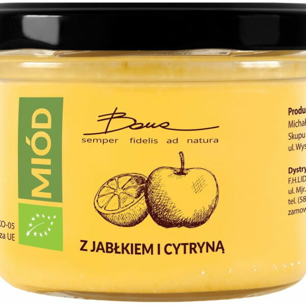 SKŁADNIKImiód wielokwiatowy* 98%, jabłko liofilizowane* 1% cytryna liofilizowana* 1% (*certyfikowany składnik ekologiczny) OPISEkologiczny miód wielokwiatowy nektarowy z dodatkiem liofilizowanego jabłka i cytryny. Ekwiwalent owocu stanowi < 20 g w 250 g produktu. WARTOŚĆ ODŻYWCZA W 100 gWartosc energetyczna: 1334 kJ /317 kcalTłuszcz: 0 gw tym kwasy tłuszczowe nasycone: 0 gWeglowodany: 79 gw tym cukry: 78 gBłonnik: < 0,5 gBiałko: < 0,5 gSól: 0 g UWAGAW zależności od warunków przechowywania, miód z uwagi na swój naturalny skład ulega procesowi krystalizacji, twardnieniu, zmianie koloru lub rozwarstwieniu, co nie wpływa na ogólne walory smakowe i użytkowe produktu ZALECANE WARUNKI PRZECHOWYWANIAChronić przed bezpośrednim działaniem promieni słonecznych.