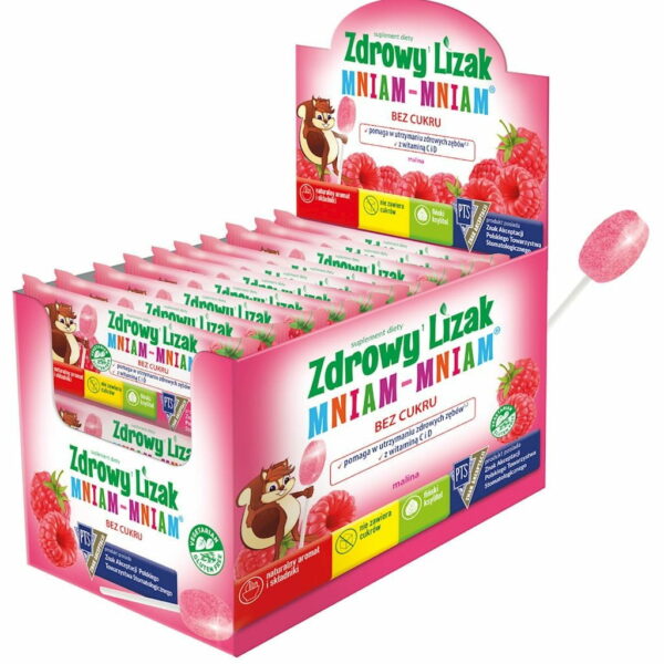 SKŁADNIKIsubstancja słodząca: ksylitol; substancja wypełniająca: izomalt; naturalny aromat malinowy; substancja przeciwzbrylająca: sole magnezowe kwasów tłuszczowych; regulator kwasowości: kwas cytrynowy; substancja przeciwzbrylająca: guma arabska; suszone maliny (0,3%); kwas L-askorbinowy (witamina C); substancja słodząca: glikozydy stewiolowe; barwnik: antocyjany; cholekalcyferol (witamina D).OPISSUPLEMENT DIETYZalecana porcja do spożycia w ciągu dnia niezbędna do uzyskania korzystnego działania produku: spożywać 1-2 lizaki dziennie. Nie należy przekraczać zalecanej porcji, tj. 2 lizaków w ciągu dnia. Produkt przeznaczony jest dla osób dorosłych i dzieci powyżej 3 roku życia. Lizak Mniam-Mniam o smaku malinowym zawiera zawiera substancje słodzące: fiński ksylitol oraz glikozydy stewiolowe. Spożywanie żywności zawierającej ksylitol zamiast cukru pomaga w zachowaniu mineralizacji zębów. Lizak zawiera witaminę D i C, kóre pomagają w prawidlowym funkcjonowaniu układu odpornościowego. Witamina D pomaga w utrzymaniu zdrowych kości, zębów oraz prawidłowym funkcjonowaniu mięśni. Witamina D bierze udział w procesie podziału komórek. Witamina C pomaga w prawidłowej produkcji kolagenu, w celu zapewnienia prawidłowego funkcjonowania kości, chrząstki, dziąseł, skóry i zębów. Produkt nie zawiera cukrów i substancji konserwujących. Produkt bezglutenowy.Niejednorodny kolor lizaka wynika z zawartości naturalnych składników produktu.WARTOŚĆ ODŻYWCZA W 100 gWartość energetyczna: 1039 kJ / 249 kcalTłuszcz: 1,4 gw tym kwasy tłuszczowe nasycone: 1,4 gWęglowodany: 95 gw tym cukry: < 0,5 galkohole wielowodorotlenowe : 93 gBłonnik: 0,9 gBiałko: < 0,5 gSól: 0,02 g Zawartość w 1 lizaku:Witamina C: 12 mg (15%*)Witamina D: 2,5 µg (50%*) Zawartość w 2 lizakach:Witamina C: 24 mg (30%*)Witamina D: 5,0 µg (100%*) *RWS dzienne referencyjne wartości spożycia witamin i składników mineralnych (dla osób dorosłych). UWAGAsuplement diety nie może być stosowany jako substytut (zamiennik) zróżnicowanej diety. Nalezy pamiętać o zrównowazonym sposobie żywienia i zdrowym trybie życia. Spożycie w nadmiernych ilościach może mieć efekt przeczyszczający. ZALECANE WARUNKI PRZECHOWYWANIAPrzechowywać w temperaturze pokojowej, w suchym miejscu, w sposób niedostępny dla małych dzieci.