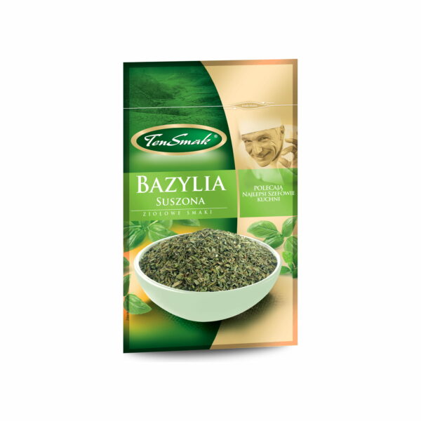 Skład: Bazylia suszona. Opis: Bazylia to niezbędny składnik większości dań kuchni śródziemnomorskiej. Posiada charakterystyczny i intensywny smak. Jest niezastąpioną przyprawą do dań z pomidorami. Poza tym bazylia doskonale komponuje się z warzywami takimi jak: brokuły, cukinia, kabaczki czy dynia. Bazylia to również podstawowy składnik włoskiego sosu pesto. Sposób użycia: Bazylia wzbogaca smak ryb, sosów do sałatek, pizzy, a także jaj i twarogów. Bazylię najlepiej dodawać do potraw pod koniec gotowania lub smażenia, gdyż wysoka temperatura niszczy jej smak. Informacje o alergenach: Może zawierać: seler, mleko(łącznie z laktozą), soję, nasiona sezamu, gorczycę. Przechowywanie: Przechowywać w suchym miejscu. Chronić od światła.