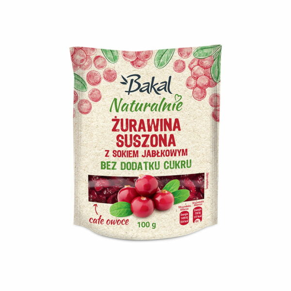 Skład: Żurawina 63%, słodzik z jabłek, koncentrat soku jabłkowego, olej słonecznikowy 1% Opis: Żurawina suszona z sokiem jabłkowym. Owoce żurawiny suszonej są bogatym źródłem wielu witamin, np.: C, B1, B6, K, Fe i wielu innych. Suszone owoce żurawiny są świetną przekąską lub dodatkiem do innych dań. W parze ze smakiem idzie szereg wielu właściwości prozdrowotnych. Żurawina działa przeciwgrzybiczo, przeciwwirusowo i moczopędnie, dlatego z powodzeniem stosowana jest przy infekcjach dróg moczowych. Ponadto zapobiega chorobom serca, działa oczyszczająco oraz wzmacniająco na organizm. Warto spożywać suszone owoce profilaktycznie. Obecne w żurawinie kwasy organiczne zapobiegają powstawaniu kamieni nerkowych. Sposób użycia: Produkt gotowy do spożycia. Informacje o alergenach: Produkt może zawierać orzeszki ziemne, inne orzechy, sezam, soje, mleko, jaja, dwutlenek siarki. Wartość odżywcza produktu w 100 g: Wartość energetyczna: 1499 KJ/354 kcal Tłuszcz: 0.8 g w tym kwasy tłuszczowe nasycone: 0.1 g Węglowodany: 83 g w tym cukry: 69 g Białko: 0.7 g Sól: 0.03 g Przechowywanie: Przechowywać w suchym i chłodnym pomieszczeniu (poniżej 25˚C) umożliwiającym wymianę powietrza, pozbawionym obcych zapachów i szkodników. Chronić przed światłem.