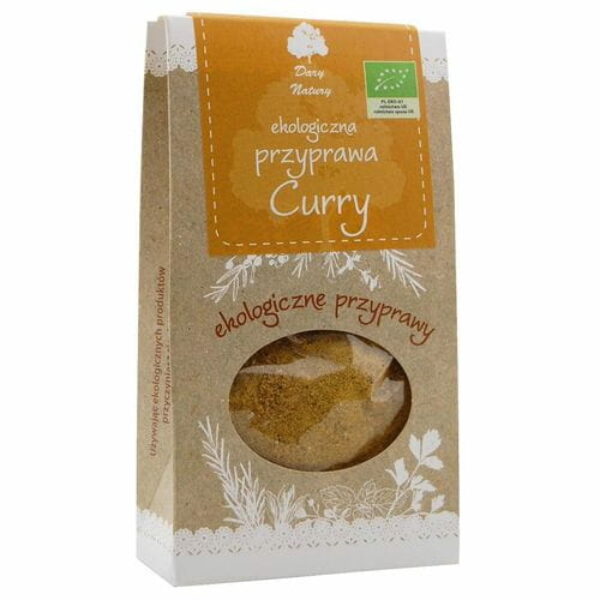 SKŁADNIKIkolendra*, gorczyca*, kminek*, kozieradka* (po 15%), chili*, imbir*, kurkuma*, koper włoski* (w różnych proporcjach) (*certyfikowany składnik ekologiczny) OPISCurry stosuje się ją najczęściej do potraw mięsnych zwłaszcza drobiu, wieprzowiny i baraniny oraz warzyw, sosów i ryżu. Nadaje im pięknej barwy. ZALECANE WARUNKI PRZECHOWYWANIAPrzechowywać w suchym miejscu