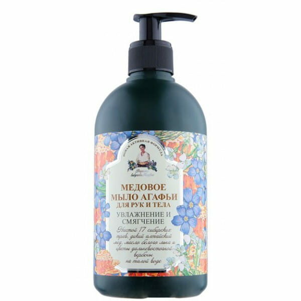 MYDŁO W PŁYNIE DO RĄK I CIAŁA MIODOWE 500 ml - RECEPTURY BABCI AGAFII Składniki aktywne: olej z białego lnu, dziki ałtajski miód, nagietek OPIS:Miodowe mydło Babci Agafii, przygotowano na wodzie zmrożonej o właściwości miękkiej „deszczówki”, z dodatkiem dzikiego ałtajskiego miodu, naturalnego oleju z białego lnu, i dalekowschodniej werbeny. Mydło pięknie oczyszcza skórę rąk i ciała, pielęgnując ją delikatnie i miękko. Dziki ałtajski miód i naturalny olej z białego lnu są unikalnymi darami przyrody, od najdawniejszych czasów cenionym ze względu na swoje pożyteczne właściwości. Wchodzące w skład mydła organiczne komponenty i uzdrawiający wyciąg z 17 syberyjskich traw, zebranych w ekologicznie czystych okręgach Ałtajskiego kraju, przeniosą Was w świat tajgi, otulą aromatem dzikich traw i kwiatów, nawilżą i uspokoją Waszą skórę. Poczujecie dobroczynne działanie starodawnych uzdrawiających recept ! SPOSÓB UŻYCIANanosimy niewielką ilość mydła na wilgotną skórę rąk i ciała, spieniamy i zmywamy ciepłą wodą.