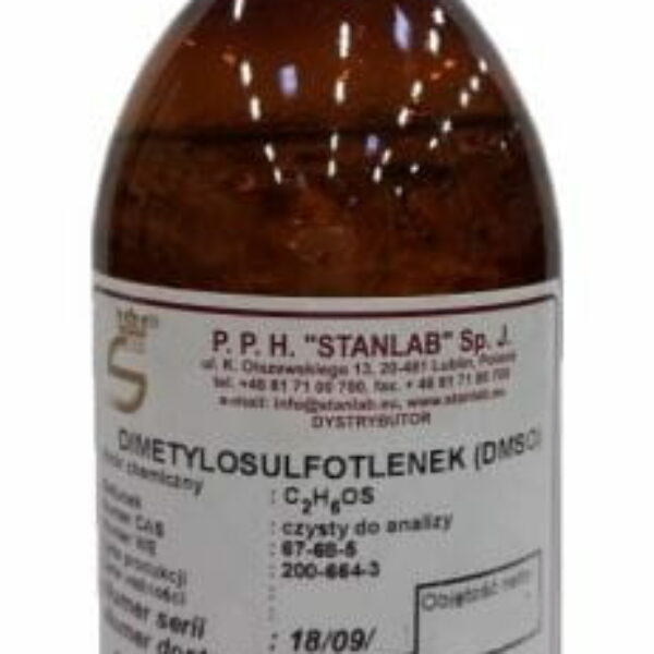 DIMETYLOSULFOTLENEK (DMSO) 500ml Dimetylosulfotlenek – organiczny związek z grupy sulfotlenków. Jest naturalną substancją pochodzącą z miazgi drzewnej. Wzór chemiczny : C2H6OS SPECYFIKACJA PRODUKTU: Postać: ciecz Barwa: bezbarwna Zapach: siarkowy Wartość pH: nie dotyczy Temperatura topnienia: 18,5°C Temperatura wrzenia: 189°C Temperatura zapłonu: 87°C (zamknięty tygiel) Palność: produkt palny (w stanie gorącym) Granice wybuchowości: dolna - 2,6%(V) górna - 28,5% (V) Prężność par: 0,556 hPa w 20°C; 4 hPa w 50°C; 20 hPa w 80°C; 49 hPa w 100°C Gęstość par: 3,48 kg/ m3 Względna gęstość par: 2,7 (powietrze = 1) Gęstość (20°C): 1104 kg/m3 Gęstość względna (20°C): 1,104 (woda = 1) Rozpuszczalność w wodzie: całkowicie rozpuszczalny w 20°C; >1000 g/l w rozpuszczalnikach organicznych: rozpuszczalny w eterze etylowym, alkoholach, węglowodorach aromatycznych Współczynnik podziału (n-oktanol/woda): logKow: -1,35 Temperatura samozapłonu: 300 -302°C Rozkład termiczny: powyżej 190°C Lepkość dynamiczna (20°C): 2,14 mPa*s Właściwości wybuchowe: nie dotyczy Właściwości utleniające: nie dotyczy Napięcie powierzchniowe (20°C): 43,5 mN/m pKa: 35,1 Stała Henry’ego: 868E-06 Pa*m3 (Substancja nie jest lotna) Współczynnik refrakcji bezwzględny (20°C): 1,4785 Pojemność: 500ml