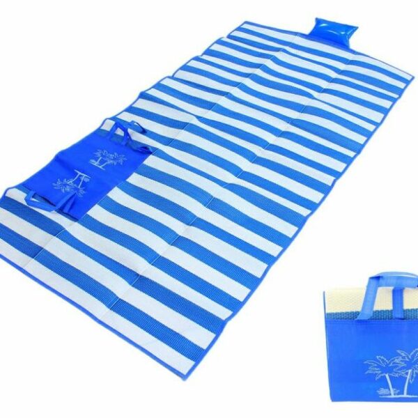 MATA PLAŻOWA Z DMUCHANĄ PODUSZKĄ NIEBIESKA Wodoodporna mata plażowa z dodatkową, nadmuchiwaną poduszką. Doskonale nadaje się do rozłożenia jej na plażowym piasku lub na pikniku w trawie. Bardzo łatwa do złożenia i rozłożenia, niezwykle trwała - świetnie zastępuje tradycyjny koc. Komfort użytkowania poprawia wbudowana poduszka. Jest bardzo lekka, a po złożeniu można ją zapiąć na pasek, co znacznie ułatwia jej przenoszenie. Wykonana z trwałego materiału. Zastosowanie pianki PVC zapewnia dużą izolacyjność od podłoża. Mata wysokiej jakości jest praktyczna, idealna do użytku podczas słonecznych dni. Jest wygodna w transporcie, dzięki zamocowanemu paskowi, za pomocą którego możemy złożyć matę na wzór torby. Jest lekka i przy tym nie zajmuje wiele miejsca. Dodatkowo jest łatwa do utrzymania czystości. Specyfikacja: Materiał: pianka PVC Waga: 300 g Wymiary (mata): 178 cm x 90 cm Długość (z poduszką): 194 cm Kolor: niebieski Opakowanie: foliowe Producent: Martom