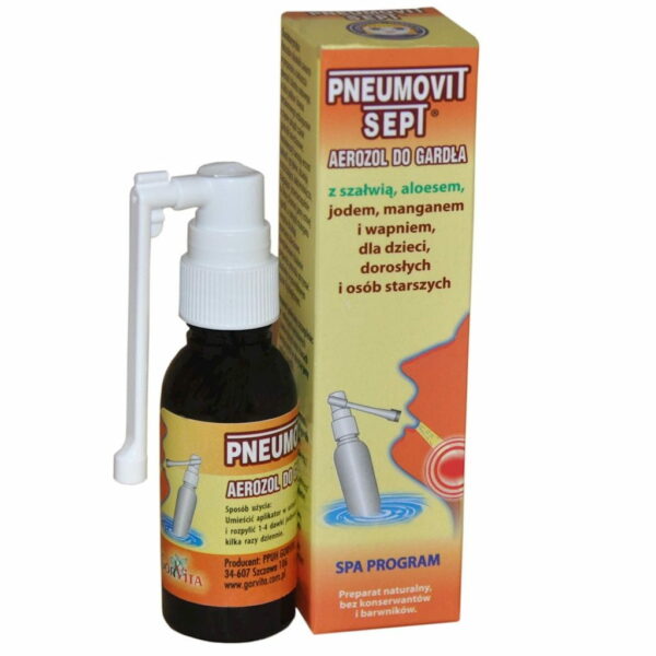 OPISPNEUMOVIT SEPT aerozol do gardła 35 ml - aerozol do gardła w infekcjach wirusowych i bakteryjnych oraz w stanach alergicznych w obrębie jamy ustnej i gardła.Naturalne składniki zawarte w preparacie a zwłaszcza obecność chlorku sodowego, a także jodków i kwasu metaborowego wzbogacone o czynne związki szałwi i aloesu (garbniki katechinowe, fenolokwasy) hamują wzrost bakterii i grzybów, działają oczyszczająco, bakteriobójczo, ściągająco i przeciwzapalnie na błonę śluzową jamy ustnej i gardła, a związki manganu i wapnia działają przeciwuczuleniowo. Aloes dodatkowo łagodzi uczucie suchości w obrębie jamy ustnej i gardła. Kompleksowe działanie preparatu pozwala utrzymać śluzówkę w prawidłowym stanie fizjologicznym.Preparat polecany szczególnie:- w infekcjach wirusowych i bakteryjnych oraz stanach alergicznych w obrębie jamy ustnej i gardła- po zabiegach stomatologicznych- w nawilżaniu i oczyszczaniu śluzówki jamy ustnej i gardła (centralne ogrzewanie, klimatyzcja, zapylenie itp.)SKŁADNIKIZmodyfikowany roztwór leczniczej wody mineralnej: wodorowęglanowi, chlorkowo, sodowej, bromkowo, jodkowo, borowej, z zawartością jodu, manganu i wapnia – właściciel koncesji Uzdrowisko Rabka S.A., extractum salviae, extractum aloe vera EAN: 5907636994282Waga: 0.06 kg