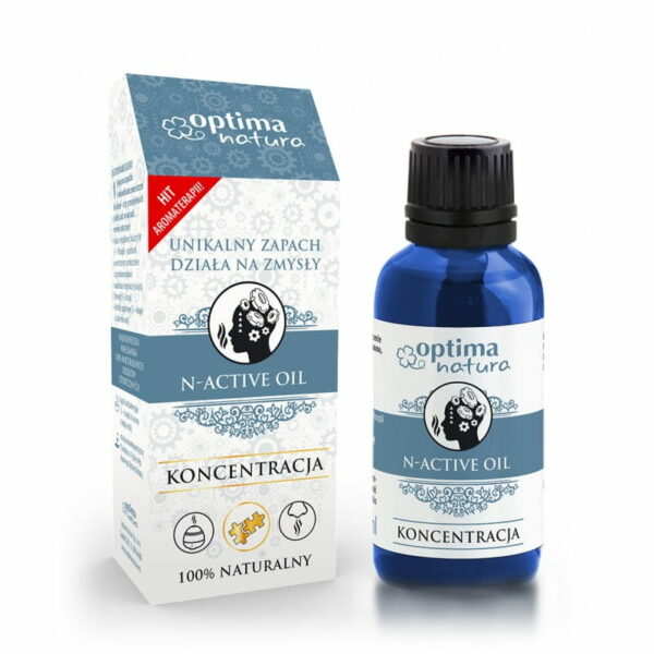 N-Active Oil Koncentracja – dobrana mieszanka olejków Cytrynowego, Miętowego i Rozmarynowego Zastosowanie mieszanki: Dyfuzory i nawilżacze (na każdy litr wody 5 – 8 kropli) Kominki zapachowe (3 – 4 krople na zbiornik wody Kąpiel motywacyjna (3 – 6 kropli do wanny z ciepłą wodą) Właściwości olejków mieszanki: Olejek eteryczny cytrynowy – poprawia jasność umysłu, polepsza nastrój, redukuje stres, a to wszystko za sprawą dopaminy i serotoniny wyzwalanych kiedy czujesz ten zapach. Olejek wspomaga koncentrację, jednocześnie zwiększając poziom energii. Olejek eteryczny z mięty – wykazuje działanie pobudzające przy nadmiernej senności. Zmniejsza uczucie zmęczenia, ociężałość umysłową oraz napięcia nerwowe. Łagodzi bóle głowy spowodowane nadmiernym skupieniem, stresem oraz niewyspaniem. Wpływa pozytywnie na kondycję umysłową oraz mobilizuje do pracy. Olejek eteryczny rozmarynowy – w swoim składzie zawiera limonene, linalol ale także eukaliptol – 1,8 cyneol, dla którego udowodniono, że zwiększa przepływ krwi do mózgu, poprawiając czujność i koncentrację. Jego zapach pomoże uspokoić umysł, opanować stres i złagodzić niepokój. Olejek jest doskonałym stymulatorem, pomaga zwalczyć niską energię, poprawia zdolności poznawcze i koncentracji. W połączeniu z olejkiem cytrynowym poprawia czujność. Nie stosować produktu nierozcieńczonego bezpośrednio na skórę. Tylko do użytku zewnętrznego. INCI: Citrus Limon Peel Oil, Rosmarinus officinalis Leaf Oil, Mentha Arvensis Leaf Oil, Limonene, Citral, Linalool.