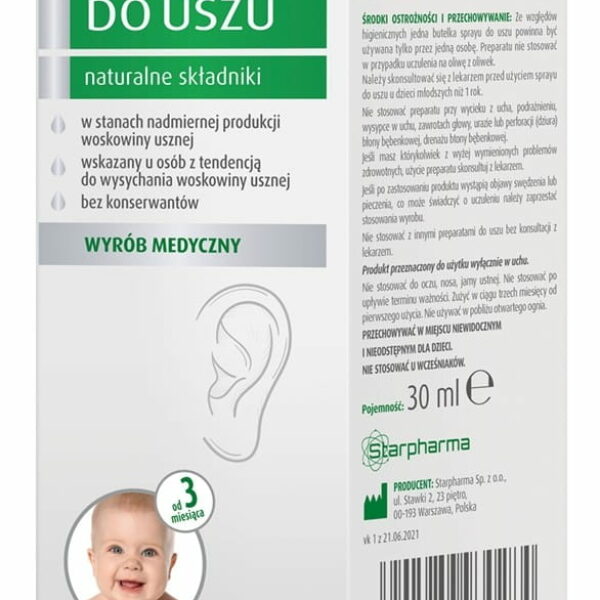 OPISSpray do uszu 30 ml- w stanach nadmiernej produkcji woskowiny usznej- wskazany u osób z tendencją do wysychania woskowiny usznej- bez konserwantówWSKAZANIAWyrób medyczny SPRAY DO USZU przeznaczony dla dorosłych, dzieci i niemowląt od 3 miesiąca życia:• w celu usunięcia w naturalny sposób nadmiaru woskowiny usznej;• aby zapobiec gromadzeniu się woskowiny w zewnętrznym przewodzie słuchowym;• do zmiękczania korków woskowinowych przed zabiegiem ich usunięcia przez lekarza.SKŁADNIKI100% naturalna oliwa z oliwek przygotowana według standardów farmaceutycznych. Nie zawiera konserwantów.INSTRUKCJA STOSOWANIAPrzed użyciem przeczytaj dołączoną do opakowania instrukcję używania. Przed pierwszym użyciem wstrząśnij butelkę i naciśnij aplikator 3-4 razy, aż do pojawienia się preparatu. Delikatnie pociągnąć płatek ucha do góry i do tyłu. Trzymając butelkę w pozycji pionowej, należy włożyć aplikator do zewnętrznego przewodu słuchowego i nacisnąć końcówkę 1-2 razy. Delikatnie masować skrawek ucha, aby dobrze rozprowadzić produkt. Powtórzyć czynność dla drugiego ucha. Używać 1-2 razy w tygodniu lub zgodnie z zaleceniami lekarza. Przed zabiegiem usuwania korków woskowiny przez lekarza, stosuj 1-2 dawki, dwa razy dziennie przez okres 4-5 dni.Po każdym użyciu należy usunąć nasadkę, opłukać wodą, wysuszyć i ponownie założyć.ŚRODKI OSTROŻNOŚCI I PRZECHOWYWANIEZe względów higienicznych jedna butelka sprayu do uszu powinna być używana tylko przez jedną osobę. Preparatu nie stosować w przypadku uczulenia na oliwę z oliwek.Należy skonsultować się z lekarzem przed użyciem sprayu do uszu u dzieci młodszych niż 1 rok. Nie stosować preparatu przy wycieku z ucha, podrażnieniu, wysypce w uchu, zawrotach głowy, urazie lub perforacji (dziura) błony bębenkowej, drenażu błony bębenkowej. Jeśli masz którykolwiek z wyżej wymienionych problemów zdrowotnych, użycie preparatu skonsultuj z lekarzem. Produkt przeznaczony do użytku wyłącznie w uchu. Nie stosować do oczu, nosa, jamy ustnej. Nie stosować po upływie terminu ważności. Zużyć w ciągu 6 miesięcy od pierwszego użycia. Nie używać w pobliżu otwartego ognia.PRZECHOWYWAĆ W MIEJSCU NIEWIDOCZNYM I NIEDOSTĘPNYM DLA DZIECI. NIE STOSOWAĆ U WCZEŚNIAKÓW.EAN: 5902989930284Waga: 0.05 kg