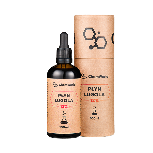 Wykorzystywany jest w badaniu obecności skrobi w produktach żywieniowych poprzez dodanie kilku kropli do badanego surowca. Te, które zawierają skrobię, pod wpływem płynu Lugola barwią się na czarno-fioletowo lub niebiesko-fioletowo. Płyn Lugola to roztwór wodny jodu w jodku potasu o bardzo czystej formie i skutecznej formie Stworzony według oryginalnej receptury opracowanej przez lekarza Jeana Lugola, co daje 100% gwarancji Oryginału Prawidłowo obliczony i stworzony pod nadzorem profesjonalnych specjalistów chemików co gwarantuje prawidłowe obliczenia zawartości substancji czynnej na 1 ml produktu. Płyn w szklanej brązowej butelce wykonanej ze specjalnego szkła HKL III Produkt posiada profesjonalną pipetę służącą do precyzyjnego odmierzania cieczy, nakrętka jest w oprawie z drzewa bambusowego Produkt zapakowany w profesjonalną wytrzymałą i estetyczną tubę aby zabezpieczyć płyn przed światłem i aby produkt był bezpiecznie dostarczany do naszych odbiorców Tuba dodatkowo zabezpieczona oryginalnym hologramem marki ChemWorld Dane Techniczne – Jod Nazwa odczynnika JOD Nazwa odczynnika (ang.) iodine Synonimy jod, jodyna, lugola Gatunek CZDA Wzór sumaryczny I2 Masa molowa [g/mol] masa cząsteczkowa: 253,8 Pojemność [ml] 100 ml Numer WE 231-442-4 Numer CAS 7553-56-2 Zawartość [%] wg receptury Gęstość 4940 kg/m3 Rodzaj pierwiastek chemiczny, izotop Wygląd zewnętrzny / postać substancja krystaliczna o ciemnofioletowej barwie Rodzaj opakowania butelka ze szkła brązowego Termin ważności minimum 20 miesiące od dostawy towaru Dane Techniczne – Jodek Potasu Nazwa odczynnika JODEK POTASU Nazwa odczynnika (ang.) potassium iodide Synonimy Kalii iodidum, Kalium iodatum Gatunek CZDA Wzór sumaryczny KI Masa molowa [g/mol] 166,00 g/mol Pojemność [ml] 100 ml Numer WE 231-659-4 Numer CAS 7681-11-0 Zawartość [%] wg receptury Gęstość 3,123 g/cm³, ciało stałe Rodzaj nieorganiczny związek chemiczny Wygląd zewnętrzny / postać biały lub prawie biały proszek lub bezbarwne kryształy Rodzaj opakowania butelka ze szkła brązowego Termin ważności minimum 20 miesiące od dostawy towaru ZAWARTOŚĆ W JEDNEJ KROPLI: 1 kropla zawiera 6 mg jodu oraz 12 mg jodku potasu. ILOŚĆ KROPLI W 1 ml: 20 kropli SKŁADNIKI: woda, jodek potasu, jod PRZECHOWYWANIE: Przechowywać w suchym, ciemnym i chłodnym miejscu, niedostępnym dla małych dzieci. OPAKOWANIE: ciemna szklana butelka + pipeta + tuba POJEMNOŚĆ: 100 ml PRODUKT JEST ODCZYNNIKIEM CHEMICZNYM ANALITYCZNYM DO SYNTEZ LUB CELÓW DYDAKTYCZNYCH. I MOŻE BYĆ SZKODLIWY DLA ZDROWIA, KAŻDE INNE STOSOWANIE ODCZYNNIKA CHEMICZNEGO JEST NA WŁASNĄ ODPOWIEDZIALNOŚĆ.