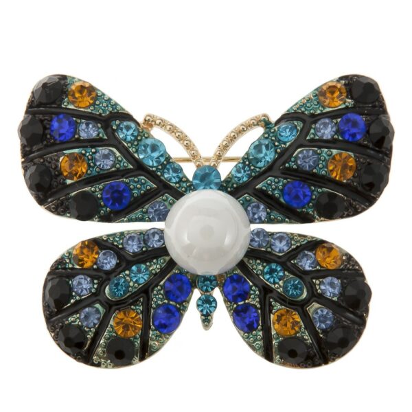 Broszka wykonana z metalu, szkła i imitacji perły. Rozmiar broszki: ok. 5,2 cm x 4,2 cm. Kolor: złoty, czarny, żółty, niebieski, biały.