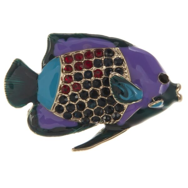 Broszka wykonana z metalu, emalii oraz szklanych kryształków. Wymiary broszki: ok. 4,5 cm x 3 cm. Kolor broszki: złoty, fioletowy, zielony, niebieski.