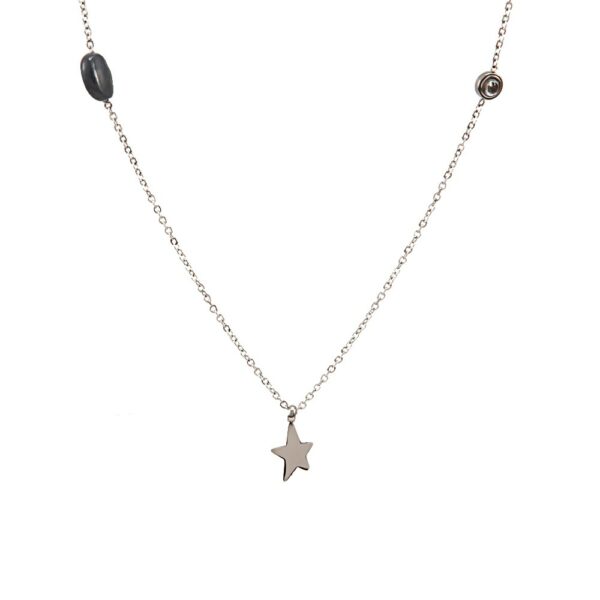 Naszyjnik gwiazda czarny, wykonany ze stali chirurgicznej/szlachetnej. Długość naszyjnika: ok.37 cm z możliwością regulacji ok. 7 cm. Średnica elementu ozdobnego ok: 1 cm. Typ zapięcia: Karabińczyk. Kolor:srebrny.