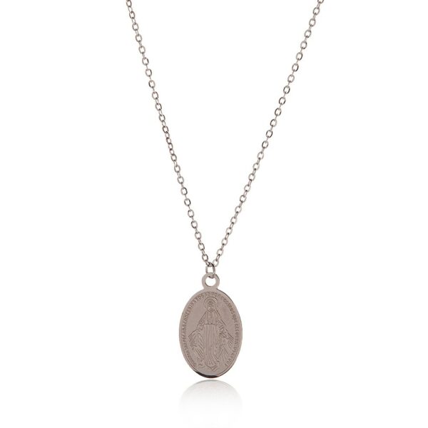 Naszyjnik medalion, wykonany ze stali chirurgicznej / szlachetnej. Długość naszyjnika: ok. 45 cm z możliwością regulacji ok. 5 cm.Wymiary elementu ozdobnego: 2,4 cm x 1,5 cm. Rodzaj zapięcia: karabińczyk. Kolor: srebrny.