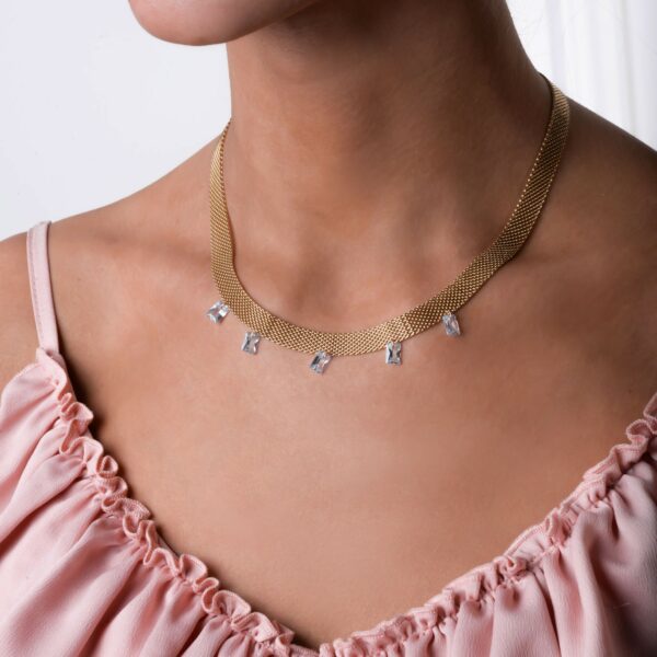 Szeroki naszyjnik z kryształkami wykonany ze stali chirurgicznej/szlachetnej. Długość naszyjnika ok. 40 cm z możlowością regulacji ok. 5 cm, szerokość ok. 0,8 cm. Typ zapięcia: karabińczyk. Kolor: złoty.