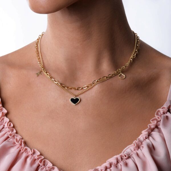 Podwójny naszyjnik serce, wykonany ze stali chirurgicznej/szlachetnej. Długość naszyjnika: ok. 40 cm z możliwością regulacji ok. 5 cm. Średnica serduszka: 1,2 cm. Typ zapięcia: karabińczyk. Kolor: złoty.