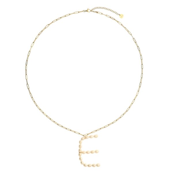 Naszyjnik literka E, perełki rzeczne, wykonany ze stali chirurgicznej / szlachetnej. Długość naszyjnika: ok. 58 cm z możliwością regulacji ok. 5 cm. Wymiary elementu ozdobnego ok: 5 cm x 3,5 cm. Typ zapięcia: Karabińczyk. Kolor: złoty.