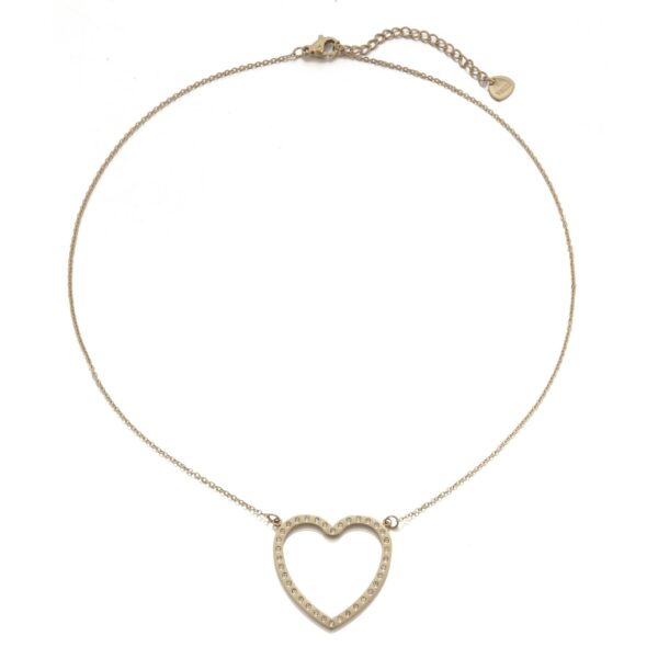 Naszyjnik serce, wykonany ze stali chirurgicznej/szlachetnej oraz szklanych kryształków. Długość naszyjnika: ok. 41 cm z możliwością regulacji ok. 5 cm. Średnica elementu ozdobnego ok: 2,8 cm. Typ zapięcia: Karabińczyk. Kolor: złoty.