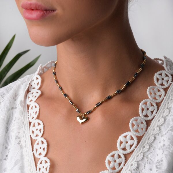 Choker serduszko, wykonany ze stali chirurgicznej/szlachetnej oraz kamienia naturalnego. Długość naszyjnika ok. 35 cm z możliwością regulacji ok. 5 cm. Średnica elementu ozdobnego: 1,5 cm. Typ zapięcia: karabińczyk. Kolor: złoty, grafitowy.