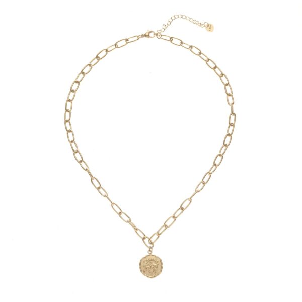 Naszyjnik zodiak Byk, wykonany ze stali chirurgicznej/szlachetnej. Długość naszyjnika: ok. 41 cm z możliwością regulacji ok. 5 cm, szerokość łańcuszka: 0,5 cm. Średnica elementu ozdobnego ok: 1,5 cm. Typ zapięcia: Karabińczyk. Kolor: złoty.