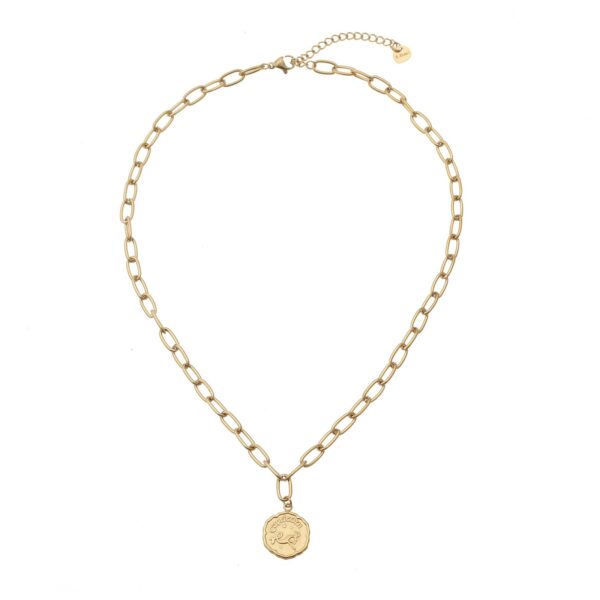 Naszyjnik zodiak Koziorożec, wykonany ze stali chirurgicznej/szlachetnej. Długość naszyjnika: ok. 41 cm z możliwością regulacji ok. 5 cm, szerokość łańcuszka: 0,5 cm. Średnica elementu ozdobnego ok: 1,5 cm. Typ zapięcia: Karabińczyk. Kolor: złoty.