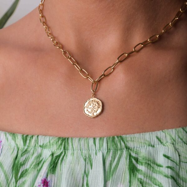 Naszyjnik zodiak Strzelec, wykonany ze stali chirurgicznej/szlachetnej. Długość naszyjnika: ok. 41 cm z możliwością regulacji ok. 5 cm, szerokość łańcuszka: 0,5 cm. Średnica elementu ozdobnego ok: 1,5 cm. Typ zapięcia: Karabińczyk. Kolor: złoty.