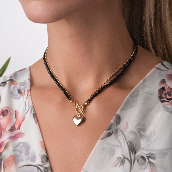 Naszyjnik serce, wykonany ze stali chirurgicznej/szlachetnej oraz czarnych kryształków. Długość naszyjnika: krótki łańcuszek ok. 38 cm, długi łańcuszek ok. 39 cm.Zapięcie z przodu typu: toggle. Kolor: złoty,czarny.