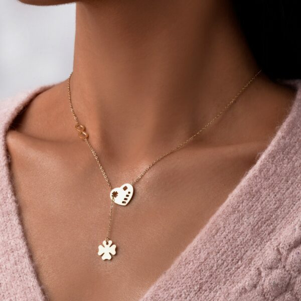 Naszyjnik koniczyna, serce, wykonany ze stali chirurgicznej /szlachetnej. Długość naszyjnika ok. 45 cm z możliwością regulacji ok 5 cm. Średnica serca ok.1,4 cm. Typ zapięcia: karabińczyk. Kolor: złoty.