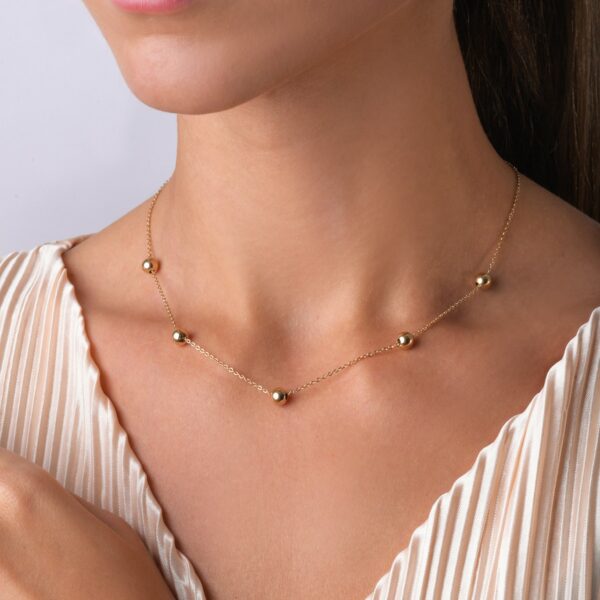 Naszyjnik kuleczki, wykonany ze stali chirurgicznej/szlachetnej. Długość naszyjnika ok. 40 cm. Średnicz kuleczki: ok. 0,5 cm i 0,6 cm . Typ zapięcia: karabińczyk. Kolor: złoty.