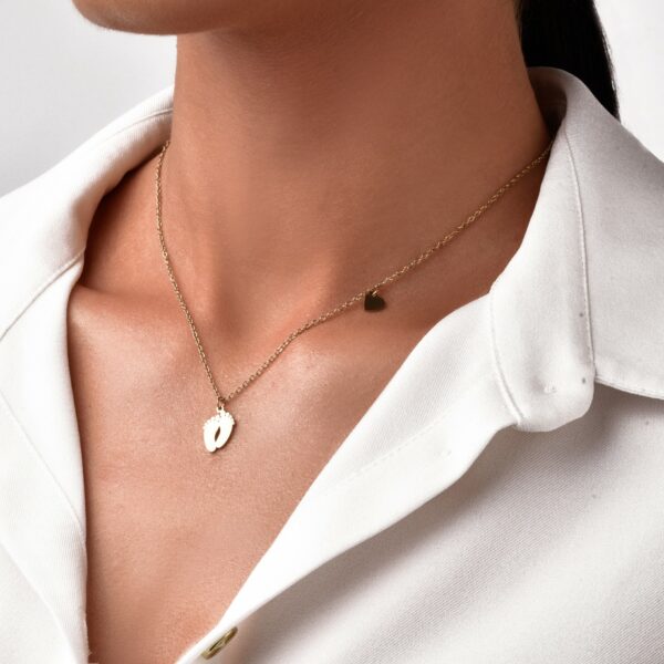 Naszyjnik stópki, wykonany ze stali chirurgicznej/szlachetnej. Długość naszyjnika ok. 40,5 cm z możliwością regulacji ok. 5 cm. Wymiary elementu ozdobnego: ok. 1,2 cm x 1 cm. Typ zapięcia: karabińczyk. Kolor: złoty.