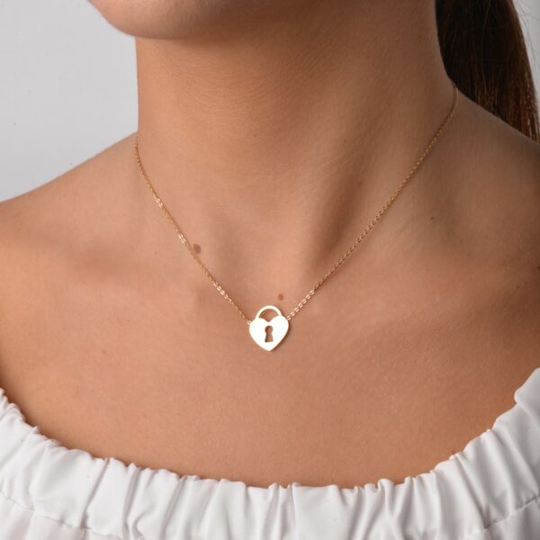 Naszyjnik serce, kłódka wykonany ze stali chirurgicznej/szlachetnej. Długość naszyjnika: ok. 40 cm z możliwością regulacji ok. 5 cm. Wymiary elementu ozdobnego ok: 1,5 cm x 1,8 cm. Typ zapięcia: karabińczyk. Kolor: złoty.