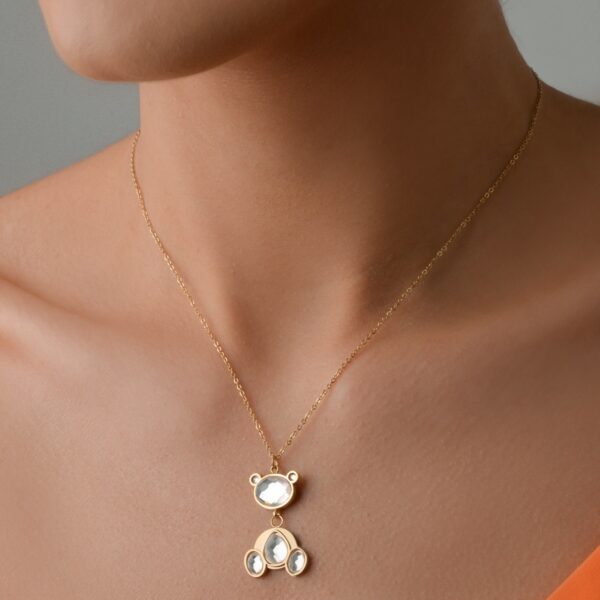 Naszyjnik kryształowy miś, wykonany ze stali chirurgicznej/szlachetnej. Długość naszyjnika: ok. 40,5 cm z możliwością regulacji ok. 5 cm. Wymiary elementu ozdobnego ok: 2,7 cm x 1,7 cm. Typ zapięcia: Karabińczyk. Kolor: złoty.