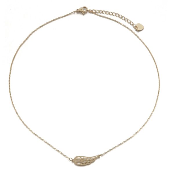 Naszyjnik skrzydło wykonany ze stali chirurgicznej/szlachetnej. Długość naszyjnika: ok. 40 cm z możliwością regulacji ok. 5 cm.Wymiary skrzydełka: 2,4 cm x 0,7 cm. Rodzaj zapięcia: karabińczyk. Kolor: złoty.