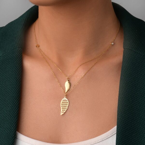 Naszyjnik podwójne skrzydełka, wykonany ze stali chirurgicznej/szlachetnej. Długość naszyjnika: ok. 40 cm z możliwością regulacji ok. 5 cm.Wymiary skrzydełka: 2,5 cm x 1 cm. Rodzaj zapięcia: karabińczyk. Kolor: złoty.