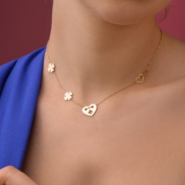 Naszyjnik serca, koniczynki, wykonany ze stali chirurgicznej / szlachetnej. Długość naszyjnika: ok. 40 cm z możliwością regulacji ok. 5 cm. Średnica elementu ozdobnego ok: 1,3 cm i 1 cm. Typ zapięcia: Karabińczyk. Kolor: złoty.