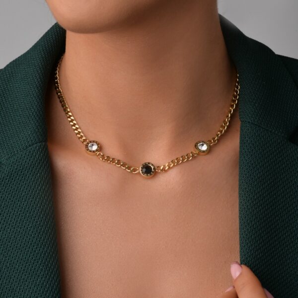Naszyjnik kółka, wykonany ze stali chirurgicznej/szlachetnej, szklanych kryształków oraz emalii. Długość naszyjnika: ok. 40 cm z możliwością regulacji ok. 5 cm. Średnica elementu ozdobnego ok: 1 cm. Typ zapięcia: Karabińczyk. Kolor: złoty.