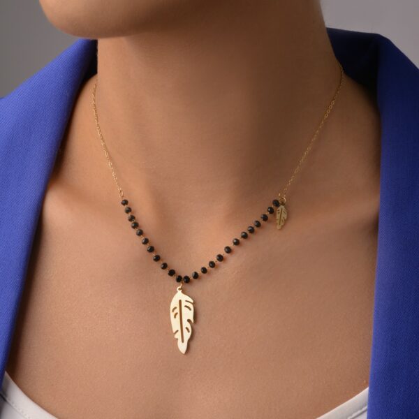Naszyjnik piórka, wykonany ze stali chirurgicznej/szlachetneji oraz czarnych kryształków. Długość naszyjnika: ok. 40 cm z możliwością regulacji ok. 5 cm. Wymiary elementu ozdobnego ok: 3 cm x 1 cm. Typ zapięcia: Karabińczyk. Kolor: czarny, złoty.