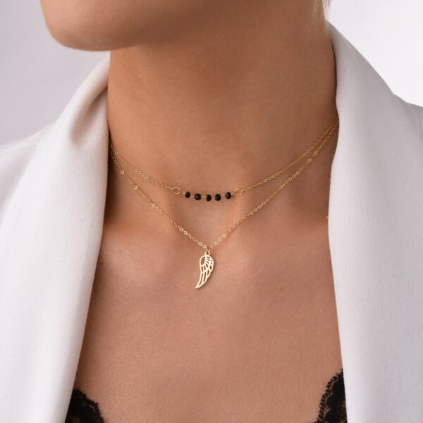 Podwójny naszyjnik skrzydełko, wykonany ze stali chirurgicznej / szlachetnej. Długość naszyjnika: krótszy łańcuszek ok. 37, dłuższy łańcuszek ok. 40 cm z możliwością regulacji ok. 5 cm.Typ zapięcia: karabińczyk. Kolor: złoty.