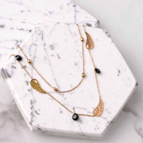 Podwójny naszyjnik skrzydła, wykonany ze stali chirurgicznej / szlachetnej. Długość naszyjnika: krótszy łańcuszek ok. 37, dłuższy łańcuszek ok. 42 cm z możliwością regulacji ok. 5 cm.Typ zapięcia: karabińczyk. Kolor: złoty.